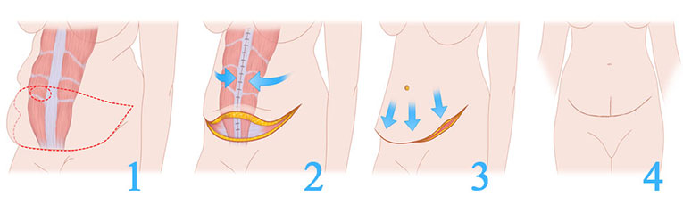 عمل جراحی ابدومینوپلاستی تحت بیهوشی عمومی انجام میشود. این روش سرپایی است و بیمار بعد از عمل به خانه برمیگردد، با توجه شرایط بیمار ممکن است در بیمارستان بستری شود. جراحی ممکن است بین ۲ تا ۵ ساعت طول بکشد. بهطورکلی این جراحی به دو شکل کامل یا محدود (مینی ابدومینوپلاستی) انجام میشود. در ابدومینوپلاستی کامل دو برش، یکی در قسمت وسط ناف و دیگری در ناحیه پایینی شکم زده میشود. در برخی موارد ممکن است ناف جابهجا شود و همچنین پوست و بافتهای اضافه جدا شود. در ابدومیبنوپلاستی محدود، برش کوچکتری نسبت به ابدومینوپلاستی کامل ایجاد میشود. پس از بريدن پوست اضافه و دوختن لبههای زخم، عمل پايان مییابد.